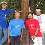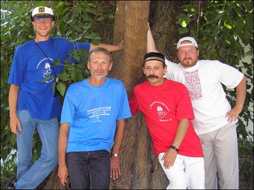 На территории дворца крымского хана в Бахчисарае. На фото (слева направо): Алексей Нежевец (Минск), руководитель клуба авторской песни БГУ; Виктор Сыроватский (Сумы), автор-исполнитель, руководитель сумского трио "Шансон", гитарный мастер; Владимир Завгородний; Вячеслав Климович (Гомель).