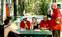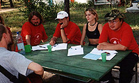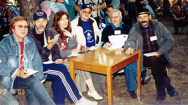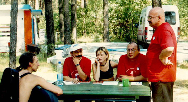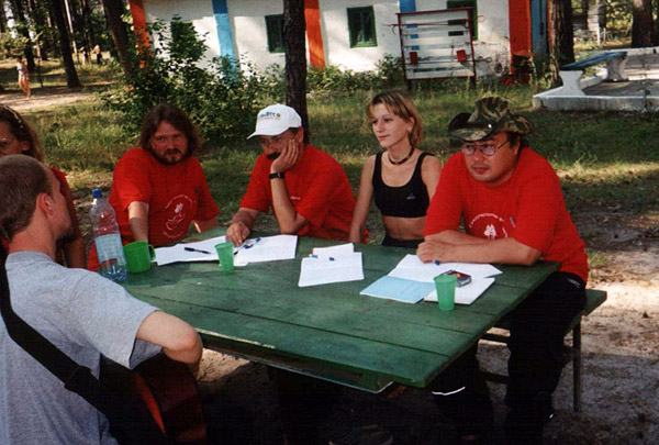 Творческая мастерская в 2004 г. Слева направо: лауреат фестиваля Сергей Хоменко (Киев), член жюри Владимир Завгородний, член жюри Ольга Ясюкович (Гомель), член жюри Вячеслав Ковалев (С.-Петербург), директор фестиваля - Вячеслав Востряков. Фестиваль проходит на турбазе Днепр на берегу днепровской протоки Кривая речка.